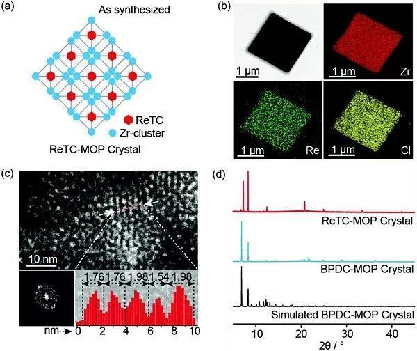 如圖2b表明ReTC單元包含在MOP籠中;圖2c中的STEM圖像顯示ReTC-MOP籠(白色球體)按周期性緊密排列,平均尺寸為1.8 nm。圖2d表明ReTC-和BPDC-MOP具有良好的結晶性。