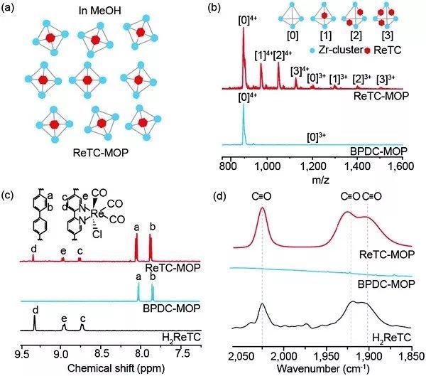 圖3 (a)ReTC-MOP籠的示意圖;(b)ReTC-MOP和BPDC-MOP的ESI質譜圖;(c)ReTC-MOP、BPDC-MOP和H2ReTC的1H NMR光譜;(d)ReTC-MOP、BPDC-MOP和分H2ReTC的紅外光譜圖。