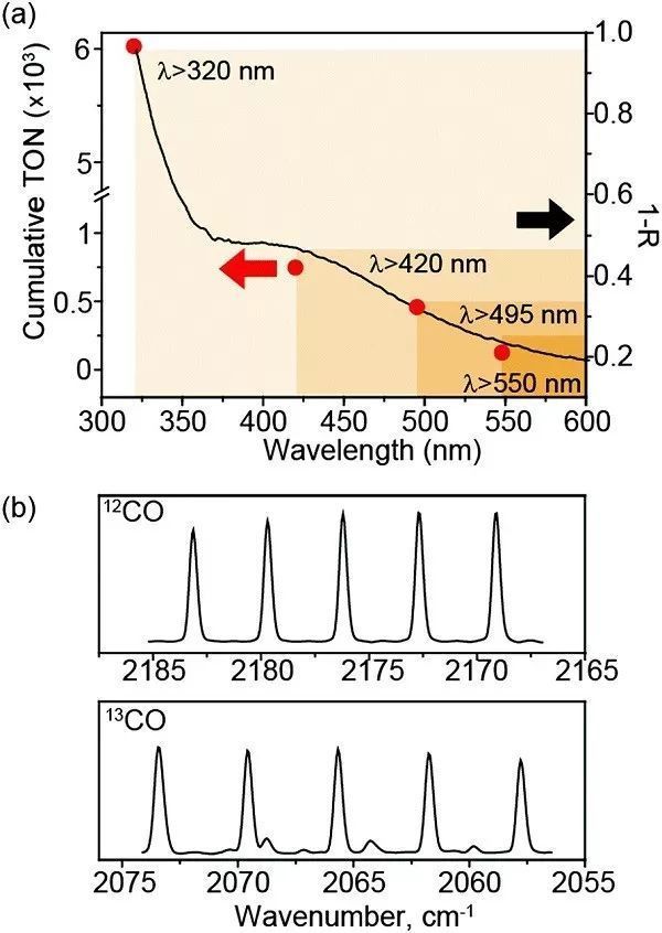 圖5 (a)ReTC-MOP的累積TON與波長的關系;(b)使用ReTC-MOP分別由12CO2和13CO2光催化產生的12CO和13CO的氣相FT-IR光譜。