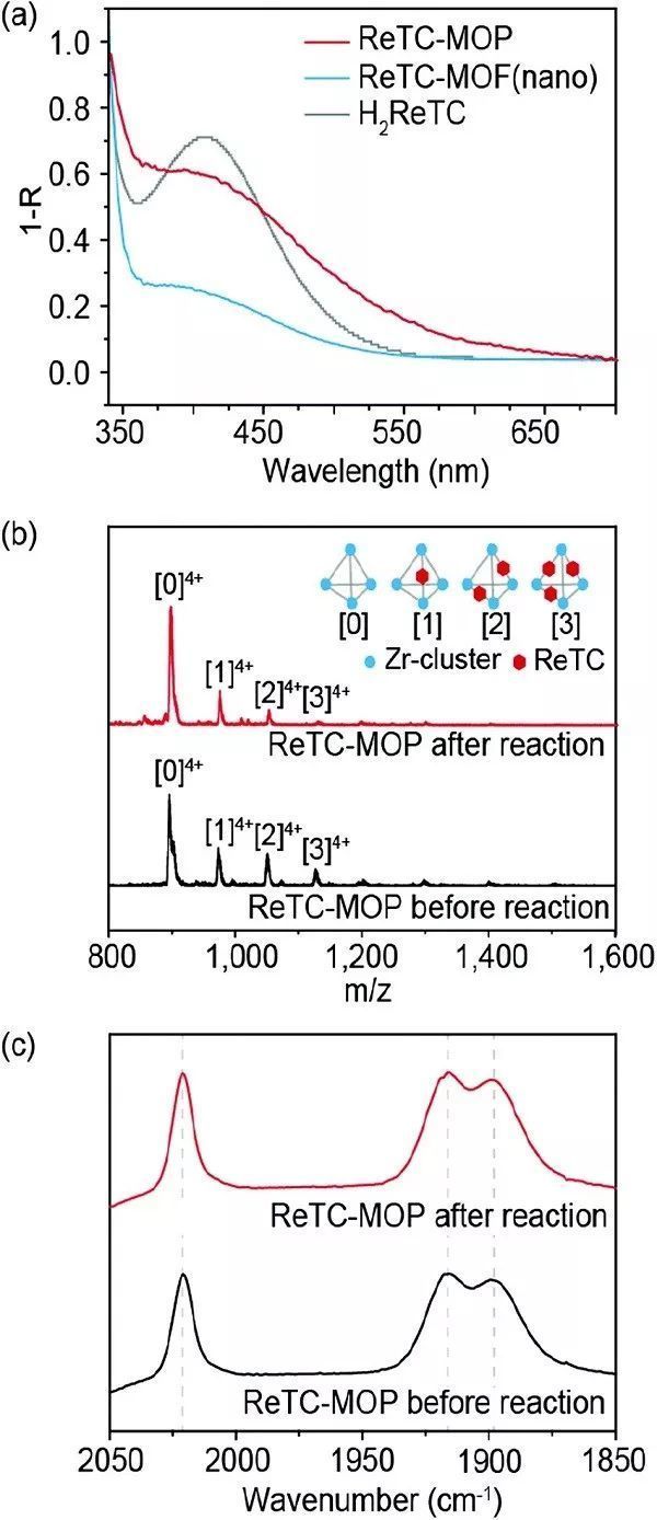 圖3b中BPDC-MOP籠m/z值為895.64和1195.53,分別對應完整的[0]4+和[0]3+籠(其中0是不帶Cl離子的BPDC-MOP籠),ReTC-MOP籠在m/z值為895.64、972.73、1050.10、1126.49、1195.53、1296.61、1401.12和1502.60,分別對應于[0]4+,[1]4+,[2]4+,[3]4+,[0]3+,[1]3+,[2]3+和[3]3+(其中1、2和3是分別具有1、2和3個ReTC單元的ReTC-MOP)。圖3c表明在ReTC-MOP的每個四面體籠中平均存在0.9個ReTC單元,在2022、1920和1910 cm-1處觀察到v(CO)特征峰,與分子H2ReTC的fac異構體一致(圖3d)。