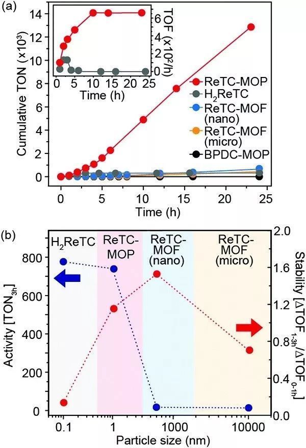 如圖4a所示,ReTC-MOP擁有比H2ReTC更好的活性和穩定性。圖4b表明,該MOP材料是迄今應用于催化的最小催化劑載體,具有原子級骨架并可以固定均相光催化劑。ReTC-MOP顆粒具有小尺寸(1.8納米),利于在反應溶液中分散,并為ReTC提供光催化所需的運動自由度。當分子催化劑與MOP結合時,由于MOP的剛性骨架可以防止ReTC失活,從而具有很高的穩定性。