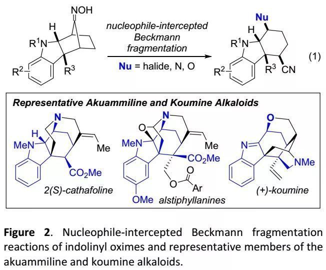 相比之下,酮肟的Beckman裂解不經(jīng)消除步驟而直接進(jìn)行親核進(jìn)攻十分罕見且鮮有報(bào)道(Figure 1),但其可能成為構(gòu)建高度官能團(tuán)化的二氫吲哚的有力手段。近日,美國達(dá)特茅斯學(xué)院Jimmy Wu課題組首次報(bào)道了親核試劑攔截的吲哚基肟的Beckmann裂解實(shí)例,即利用多種親核試劑合成得到含四個(gè)連續(xù)手性中心的環(huán)己基[b]二氫吲哚(eq 1),將有助于吲哚生物堿akuammiline和koumine家族天然產(chǎn)物的快速合成(Figure 2)。該成果發(fā)表于近期Chem. Sci.(DOI: 10.1039/C9SC00926D)。