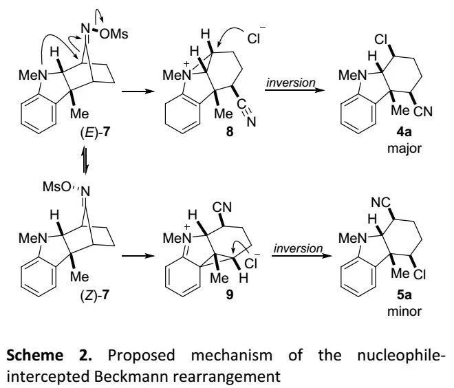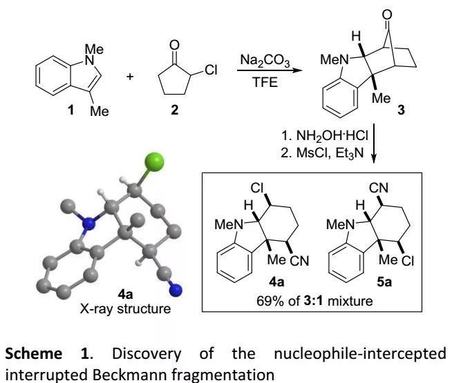 作者一直致力于開發(fā)涉及吲哚和相關(guān)雜環(huán)的新反應(yīng),并報(bào)道了3-取代吲哚與各種α-鹵代酮衍生的氧代烯丙基正離子之間的[3+2]環(huán)化得到雙環(huán)酮3(Scheme 1)。然而,作者將酮3轉(zhuǎn)化為相應(yīng)的肟后,用MsCl處理并未得到典型的Beckmann重排產(chǎn)物,而主要產(chǎn)生氰基氯4a(52%)及其區(qū)域異構(gòu)體5a(17%),其結(jié)構(gòu)經(jīng)SXRD和NMR確證。