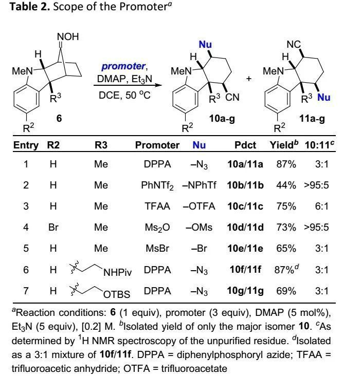 接下來,作者尋求擴(kuò)展親核試劑攔截的Beckmann裂解的適用范圍(Table 2),包括除氯化物之外的親核試劑。作者推斷用除MsCl以外的引發(fā)劑可以活化肟進(jìn)行裂解,同時(shí)為推定中間體8和9的開環(huán)提供不同的親核試劑。因此,用DPPA處理各種肟6可以得到預(yù)期的氰基疊氮化物。此外,利用PhNTf2、TFAA和Ms2O等引發(fā)劑產(chǎn)生的相對(duì)較弱的親核試劑也可以得到相應(yīng)的三氟甲磺酰胺、三氟乙酸酯和甲磺酸酯產(chǎn)物,而用MsBr時(shí)可以得到溴化物。