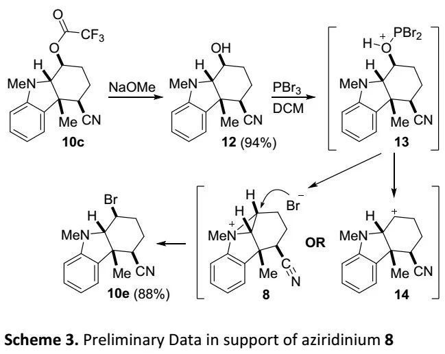 為了驗(yàn)證所提出的氮丙啶鎓中間體8的有效性,作者選擇研究10c和12轉(zhuǎn)化成相應(yīng)溴化物的立體化學(xué)結(jié)果(Scheme 3)。作者假設(shè)活化醇12可以導(dǎo)致推定的氮丙啶鎓中間體8的再生并后續(xù)通過溴化物開環(huán),該過程將通過雙重立體反轉(zhuǎn)進(jìn)行得到10e。然而,反應(yīng)若經(jīng)游離碳正離子14進(jìn)行,則可以得到非對(duì)映異構(gòu)體或烯烴副產(chǎn)物。因此,將三氟乙酸酯10c水解產(chǎn)生12后,再經(jīng)PBr3處理得到單一產(chǎn)物10e,未檢測(cè)到烯烴或立體異構(gòu)體的存在。