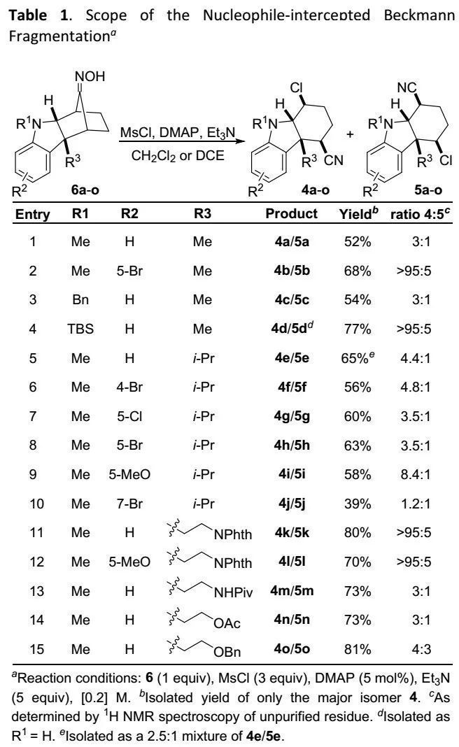 對(duì)于這一意外發(fā)現(xiàn),作者好奇該反應(yīng)是否可以完全轉(zhuǎn)化。實(shí)際上,親核試劑攔截的Beckmann裂解具有廣泛的取代基(R1-R3)和官能團(tuán)耐受性(Table 1)。二氫吲哚氮原子上可以被甲基、芐基和TBS取代,其芳環(huán)也可以被各種鹵素、甲基或甲氧基取代;色胺和色醇衍生的肟也可以順利反應(yīng)得到相應(yīng)的產(chǎn)物。當(dāng)用含游離氫的二氫吲哚衍生的肟時(shí),易導(dǎo)致分解。在上述任何反應(yīng)中,均未檢測(cè)到任何類似Grob的裂解產(chǎn)物。4和5之間的區(qū)域選擇性范圍很寬(3:1~95:5),但區(qū)域異構(gòu)體一般可以通過柱層析分離。