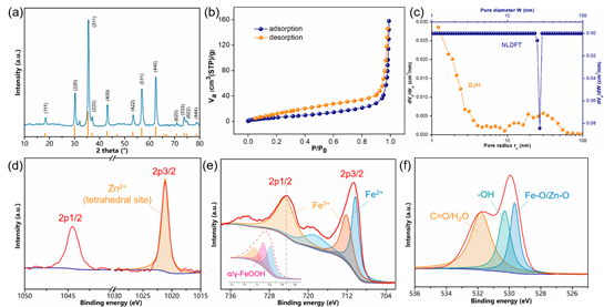 圖2 ZFO的(a) XRD,(b) N2吸附/脫附等溫線,(c) 孔徑分布擬合結果,(d) Zn 2p,(e) Fe 2p和(f) O 1s的XPS分峰擬合。