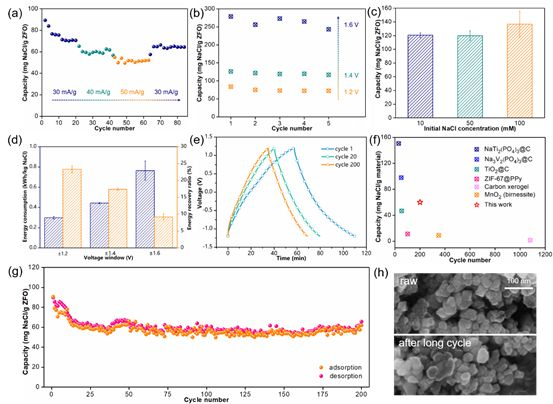 圖4 在不同(a) 電流密度,(b) 電壓范圍和(c) 初始NaCl濃度下的脫鹽容量,(d) 不同電壓下的能耗和能量回收率,(e) 在長循環脫鹽實驗中,第1、20和200個循環的電壓-時間曲線,(f) ZFO與其它新材料之間的脫鹽容量和循環穩定性的比較,(g) 電流密度(40 mA/g)和電壓范圍(±1.2 V)下的長循環性能, (h) 長循環脫鹽實驗前后ZFO電極的SEM圖像。