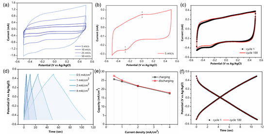 圖3 (a) 在不同掃描速率下測得的CV曲線,(b) 掃描速率為5 mV/s的CV曲線,(c) 10 mV/s下100次循環后的CV曲線,(d) 不同電流密度下的GCD曲線,(e) 不同電流密度下的充放電容量,(f) 2 mA/cm2下100個循環后的GCD曲線。