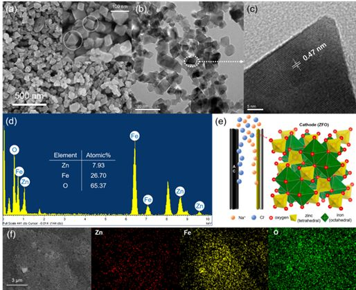 圖1 ZFO的(a) SEM圖像,(b, c) TEM圖像,(d) EDS分析,(e) 脫鹽過程和ZFO晶體結構的示意圖,(f) SEM-mapping。