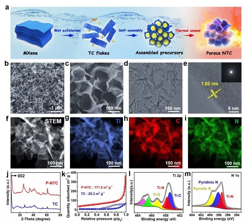 ▲ 共同第一作者:宋英澤、孫中體、樊趙地、蔡文龍;共同通訊作者:孫靖宇、張強論文DOI:10.1016/j.nanoen.2020.104555由于較高的能量密度(2600 Wh·kg-1)和理論比容量(1672 mAh·g-1),鋰硫電池被認為是下一代先進的儲能體系,是當今高比能動力電池領域研究的熱點和亟需突破的重點體系。然而,鋰硫電池依然存在硫的利用效率較低、電化學性能差以及安全性問題,限制了其實用化進程。這主要歸因于多硫化鋰的穿梭效應和緩慢的電化學反應動力學過程。構建和使用極性的電催化材料不僅可有效調控多硫化鋰的演化,而且還能催化電化學反應的動力學過程,提升電池的可逆容量、倍率和循環性能,對推進鋰硫電池的商業化進程具有極為關鍵的作用。多硫化鋰的穿梭效應是由鋰硫電池電化學體系中的濃度梯度力和電場力共同作用引起的,可造成活性材料硫的不可逆損失,電池容量下降;難溶的Li2S2和Li2S在金屬鋰表面沉積,增大反應極化,延長充電過程,從而導致了電池較差的循環穩定性。采用具有豐富極性位點的材料可對多硫化鋰進行化學錨定,從而有利于減輕多硫化鋰的穿梭效應。電化學反應過程滯緩是多硫化鋰多步復雜物相轉變的直接結果。在電化學反應環境中,多硫化鋰頻繁地接觸電解液,電化學反應延長,形成不可逆的“死硫”,從而導致電池實際容量偏低,循環壽命下降。采用可導的過渡金屬化合物如氮化物、碳化物、磷化物、硼化物等可以有效催化電化學反應的動力學過程,優化電化學反應環境,提升電池的電化學性能。基于上述科學問題,本人設想能否優化現有電催化劑的結構和性能,進一步提升其對鋰硫化學的催化效率?為此,我們引入模板限域合成方法,設計并構建了多孔的氮摻Ti3C2 MXene(P-NTC)電催化型宿主材料(圖1)。實驗表明,與剝離的純片層MXene(TC)相比,P-NTC比表面積提高了5.8倍,有效增加了多硫化鋰的吸附和轉化位點;其優異的電子傳導性有利于多硫化鋰的轉化反應;氮原子的引入形成了“Ti-N”和“Li-N”鍵,降低了Li2S分解的能壘,從而有效催化了電池的反應動力學過程。因此,P-NTC是多功能的電催化劑,可有效解決鋰硫電池在熱力學和動力學方面的問題,提升其電化學性能。最終研究結果發表在Nano Energy (Nano Energy, 2020, DOI: 10.1016/j.nanoen.2020.104555)上。本文研究的重點在于明確P-NTC電催化劑的構效關系;理解P-NTC催化功能中的協同分工作用機制。▲ 圖1 P-NTC電催化劑的設計路線及對鋰硫化學的作用機制