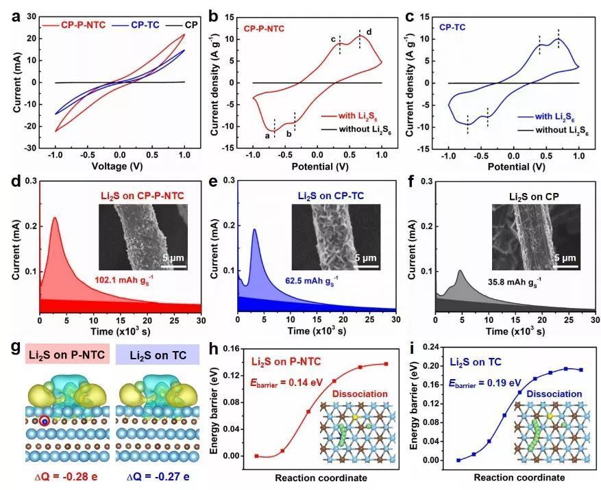 P-NTC的合成過程包括:三聚氰胺(MF)球形模板和TC前驅體的濕法合成;TC在MF表面的自組裝;500 ℃下模板的犧牲等。合成的P-NTC呈現出多孔的形貌、較高的比表面積(171.5 m2·g-1)和均勻的氮摻雜分布(圖2)。其中,摻雜的N原子包括吡啶氮和吡咯氮;同時,P-NTC中具有豐富的“Ti-C”、“Ti-N”和“Ti-O”鍵。可視化吸附實驗及原位拉曼光譜測試表明:與TC相比,P-NTC對多硫化鋰具有更加高效的化學錨定作用(圖3)。這可歸因為:高的比表面積增加了對多硫化鋰的吸附位點數量;NTC具有“Ti-C”、“Ti-N”和“Ti-O”鍵,增加了對多硫化鋰的吸附位點種類。▲ 圖3 基于P-NTC的可視化吸附實驗、S/P-NTC原位拉曼光譜探測實驗和理論計算結果表明:MF模板的使用賦予P-NTC豐富的多硫化鋰轉化位點;優異的電子傳導性有利于多硫化鋰的轉化反應;N原子的引入增加了P-NTC與Li原子及Li2S的界面結合作用,從而促進了Li2S的成核反應;N原子的引入降低了Li2S分解的能壘,有效催化了電化學反應的氧化過程(圖4)。因此,P-NTC可作為一種多功能的電催化劑有效調控電化學反應的動力學過程。▲ 圖4 P-NTC、TC的對稱電池CV曲線、Li2S成核實驗;對Li原子和Li2S的吸附作用和分解能壘的DFT理論計算由于P-NTC對多硫化鋰的有效吸附和對電化學反應過程的高效催化作用,S/P-NTC呈現出較高的放電容量,良好的倍率和循環性能(圖5)。其中,2.0 C的倍率下,電極的初始容量為820 mAh·g-1,循環1200圈容量衰減率為平均每圈0.033%。