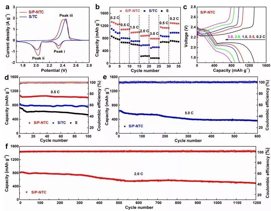 ▲ 圖5 S/P-NTC的CV曲線、倍率、充放電曲線和在0.5、5.0、2.0 C下的循環性能