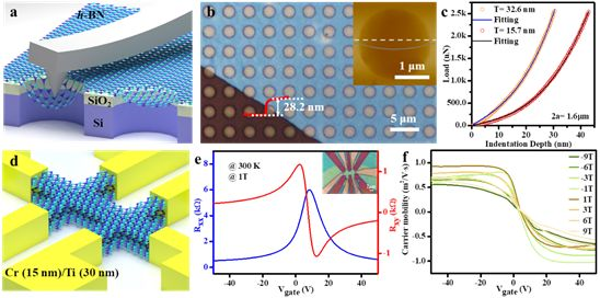 共同第一作者:時(shí)志遠(yuǎn),王秀君通訊單位:中國科學(xué)院上海微系統(tǒng)與信息技術(shù)研究所論文DOI:10.1038/s41467-020-14596-3采用氣-液-固(VLS)合成策略,利用熔融Fe82B18合金和N2作為反應(yīng)物,基于液態(tài)合金中存在的大量空位而構(gòu)成的遷移通道及藍(lán)寶石(sapphire)襯底與六方氮化硼(h-BN)的取向關(guān)系,在液固界面獲得5-50 nm厚大面積高質(zhì)量多層h-BN。通過原位近常壓光電子能譜等手段系統(tǒng)研究多層h-BN形核生長過程,進(jìn)一步提出多層h-BN生長的“溶解-擴(kuò)散-外延”新機(jī)制,該方法對于可控制備二元體系二維晶體薄膜具有一定的開拓意義。通過構(gòu)筑h-BN/Graphene/h-BN異質(zhì)結(jié)構(gòu),驗(yàn)證了多層h-BN作為介質(zhì)襯底和封裝層對保持二維晶體本征特性的積極作用。該工作為制備高質(zhì)量大面積多層h-BN薄膜并進(jìn)一步替代傳統(tǒng)機(jī)械剝離片層提供新思路,以期在未來二維晶體理論研究及器件規(guī)模化構(gòu)筑中發(fā)揮巨大作用。面向二維晶體理論研究與器件應(yīng)用,h-BN以原子級平整表面、無懸掛鍵及良好的理化穩(wěn)定性等優(yōu)勢,成為目前最具潛力的二維晶體器件的介質(zhì)襯底和封裝材料。此外,其與石墨烯耦合所產(chǎn)生的新奇物理特性同樣廣受關(guān)注。近年來,基于CVD法在催化金屬或合金襯底表面制備大面積單層h-BN單晶取得飛速發(fā)展。中科院上海微系統(tǒng)所吳天如、盧光遠(yuǎn)、時(shí)志遠(yuǎn)等研究人員著眼于h-BN單晶生長與異質(zhì)結(jié)構(gòu)筑等領(lǐng)域也展開了一系列研究。相比于單層h-BN,具有一定厚度的多層h-BN可以更加有效的屏蔽來自襯底和外界環(huán)境的干擾,在保持二維晶體本征特性中發(fā)揮關(guān)鍵作用。然而,多年來大面積高質(zhì)量多層h-BN薄膜制備技術(shù)一直未能取得突破。基于機(jī)械剝離h-BN片層作為介質(zhì)襯底和封裝層的單個(gè)二維晶體器件原型演示難以適應(yīng)未來規(guī)模化應(yīng)用。2月12日,《自然-通訊》(Nature Communications)在線刊發(fā)了中國科學(xué)院上海微系統(tǒng)與信息技術(shù)研究所(以下簡稱“中科院上海微系統(tǒng)所”)信息功能材料國家重點(diǎn)實(shí)驗(yàn)室吳天如研究團(tuán)隊(duì)與王浩敏研究團(tuán)隊(duì)以及上海科技大學(xué)物質(zhì)學(xué)院劉志研究團(tuán)隊(duì)基于氣-液-固法在介質(zhì)襯底表面制備大面積多層h-BN的研究成果。論文題目為“Vapor–liquid–solidgrowth of large-area multilayer hexagonal boron nitride on dielectricsubstrates”,中科院上海微系統(tǒng)所為唯一通訊單位。時(shí)志遠(yuǎn)博士和15級博士生王秀君為共同第一作者,吳天如副研究員與王浩敏研究員為共同通訊作者。該研究創(chuàng)造性提出一種制備多層h-BN的新策略,突破了目前二維材料與器件應(yīng)用缺少與之匹配的大面積高質(zhì)量介質(zhì)材料的科學(xué)難題。在本論文中,研究人員通過設(shè)計(jì)新型Fe-B合金體系,以熔融Fe82B18合金和氣態(tài)N2為出發(fā)點(diǎn)采用氣液固生長策略實(shí)現(xiàn)多層h-BN制備(圖1a)。所得h-BN連續(xù)膜具有較好的厚度一致性而且具有良好的層間堆垛(圖1b和1c)。值得一提的是,Fe82B18合金具有較低的熔點(diǎn)(~1174 oC),該合金不僅可以持續(xù)提供B源,還可以催化N2裂解形成N原子,促進(jìn)合金體系中B原子與N原子化合形成B-N對并溶解至液態(tài)合金中,通過液態(tài)合金中存在的大量空位所構(gòu)成的擴(kuò)散通道擴(kuò)散至液態(tài)Fe82B18合金/固態(tài)sapphire襯底界面形成h-BN,進(jìn)一步利用sapphire與h-BN取向關(guān)系促進(jìn)多層h-BN外延生長(圖1d)。通過氣-液-固法實(shí)現(xiàn)sapphire襯底表面5-50 nm厚多層h-BN可控制備。所得多層h-BN的拉曼E2g振動模式半峰寬約為10.4 cm-1,其X-射線衍射中的(002)衍射峰半峰寬小于0.19o,表征結(jié)果均表明所得多層h-BN具有較高的結(jié)晶質(zhì)量。圖1 基于氣-液-固法實(shí)現(xiàn)介質(zhì)襯底表面大面積多層h-BN可控制備。(a)基于Fe82B18合金和N2作為源物質(zhì)的藍(lán)寶石(sapphire)襯底表面多層h-BN制備流程圖;(b)Sapphire上多層h-BN的截面透射電子顯微鏡(TEM)圖像,多層h-BN厚度約為40 nm;(c)多層h-BN的高分辨TEM圖像,插圖為對應(yīng)的快速傅里葉變換(FFT)斑點(diǎn);(d)Sapphire襯底上h-BN的原子排列模型,sapphire與h-BN存在30°轉(zhuǎn)角。研究團(tuán)隊(duì)基于原子力顯微鏡(AFM)測量不同厚度的多層h-BN的力學(xué)性能(圖2a)。通過“干法轉(zhuǎn)移”工藝將多層h-BN連續(xù)膜轉(zhuǎn)移至具有陣列微孔的SiO2 (300nm)/Si襯底表面,圖2b為轉(zhuǎn)移后多層h-BN的光學(xué)顯微鏡(OM)圖像以及單一微孔上多層h-BN的AFM形貌相。通過測量不同厚度多層h-BN的力-位移曲線,CVD法所得多層h-BN的楊氏模量約為1.04 ± 0.1 TPa,接近理論計(jì)算數(shù)值(圖2c)。研究團(tuán)隊(duì)進(jìn)一步利用“干法轉(zhuǎn)移”和“精準(zhǔn)堆疊”工藝構(gòu)筑h-BN/Graphene/h-BN異質(zhì)結(jié)構(gòu),進(jìn)一步通過一維接觸構(gòu)筑霍爾器件(圖2d)。測量結(jié)果表明,CVD法制備多層h-BN作為介質(zhì)襯底和封裝層對保持Graphene本征特性具有積極作用(圖2e和2f)。圖2 多層h-BN的力學(xué)性能表征及電子學(xué)應(yīng)用。(a)基于AFM平臺測量多層h-BN力學(xué)性能的示意圖;(b)SiO2 (300 nm)/Si襯