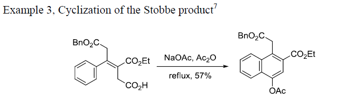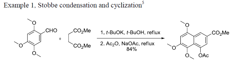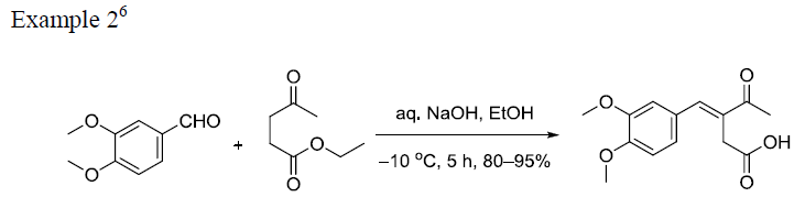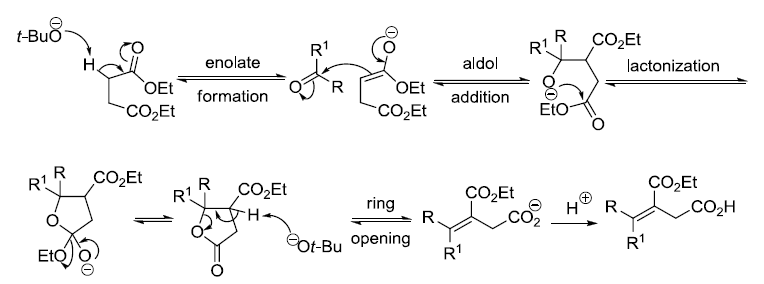 丁二酸二乙酯先對羰基化合物進行aldol加成,接著形成內酯,強堿拔氫消除開環得到產物。