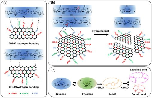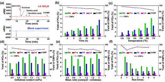 論文DOI:10.1016/j.apcatb.2020.118732隨著石化資源的日益枯竭,木質纖維素催化轉化成可再生化學品和燃料引起越來越多科研人員的關注。農林生物質精制過程所產生的碳水化合物部分稱為纖維素和半纖維素,被認為是一種很有前景的可再生化學品。從纖維素中分離出來的纖維素納米纖絲CNFs是一種可再生可降解的納米材料,因其出色的物理化學性能(如高長徑比、高比表面積、優良的光學特性等)而受到廣泛關注,并且已成功應用在能源存儲、3D打印、透明器件和生物醫療等領域。目前,CNFs的制備方法一般分為機械解離法、化學氧化法和生物化學預處理與高壓均質相結合的方法。這些方法或多或少存在高成本、高能耗、潛在毒性、化學試劑回收困難等問題。因此需要找到一種能克服上述困難的新方法。液體酸雖能輕易水解纖維素的β-1,4糖苷鍵去除無定形區,使纖維碎片化,但酸回收是CNFs制備過程的一大難點。近年來,固體酸如離子交換樹脂、沸石、雜多酸和磺化介孔硅等因其高催化活性、低腐蝕性、可回收等優勢已成功應用在纖維素水解方面。木素基固體酸因其原料價廉、來源豐富,更受研究者的青睞。陳克復院士團隊近年來致力于植物微納米纖維素的制備、表征和功能改性及其應用研究工作,在纖維素納米纖絲的酶解制備、熒光動態表征和化妝品、油水分離界面調控、導電導熱傳感器件等應用領域上取得一系列原創性研究成果。纖維素微納米纖絲的制備是根本,為后續表征和應用提供原料。結合團隊多年來在基于造紙過程的植物纖維清潔分離與利用和木素基多功能材料領域的積累和優勢,他們設想是否能利用植物纖維設計一種木素基固體酸,實現纖維素微納米纖絲的低能耗和低成本制備。實驗結果發現,合成的木素基固體酸含有豐富的含氧官能團,能部分催化降解纖維素。陳克復院士團隊以玉米秸稈酶解殘渣為原料,經堿溶酸析過程分離出木素,木素再經部分碳化和濃硫酸磺化成功制備出木素基固體酸(LC-SO3H)(圖1a)。并以其作為催化劑,催化降解纖維素得到CNFs(圖1b)。圖1. (a)木素基固體酸(LC-SO3H)的制備和(b)水解纖維素制備CNFs通過FT-IR表征(圖2a)發現,木素基固體酸上存在-SO3H、-COOH和酚羥基。XPS表征(圖2b)和元素分析表征(圖2c)進一步證明磺化后-SO3H的成功引入。圖2. LC-SO3H的FT-IR、XPS、EA、XRD、TGA、31P-NMR表征LC-SO3H參與水解的情況下(圖3a),采用高效液相色譜追蹤檢測水解液中各單因素實驗中平臺化合物(葡萄糖、果糖、5-羥甲基糠醛、乙酰丙酸、甲酸)的變化規律(圖3b-e)。同時,單因素實驗確定了能得到高得率CNFs的工藝條件。該論文一個突出的創新點是所制備的固體酸重復利用可達5次(圖3f)。催化水解過程中有兩種界面驅動力促成纖維素和固體酸的有效接觸(圖4a):一種是極強的OH-O氫鍵,由纖維素上的羥基和固體酸上的含氧官能團之間的聯接;另一種是CH-p鍵合(屬范德華力),由纖維素上疏水的C-H和固體酸表面上疏水的芳香環之間的聯接。有研究表明(ACS Catalysis,2015,5,6422-6425、ChemSusChem,2014,7,1443-1450、ChemSusChem,2015,8,534-543),纖維素吸附在固體酸表面是由CH-p鍵合驅動。固體酸表面的活性位點接觸纖維素后,β-1,4-糖苷鍵開始斷裂,纖維素緩慢碎解。與此同時,由于固體酸的無定形結構,在水解過程中會破碎(圖4b)。水解過程中溶出的多糖會進一步分解成寡糖和葡萄糖,產生的葡萄糖會轉化成果糖,后被固體酸催化成5-羥甲基糠醛、乙酰丙酸和甲酸(圖4c)。圖4. (a) OH-O和CH-p鍵合的示意圖,(b)β-1,4-糖苷鍵的裂解和LC-SO3H后的裂解, (c) 由LC-SO3H催化的葡萄糖及其轉化為果糖、5-羥甲基糠醛、乙酰丙酸、甲酸論文作者提出了用一種木素基固體酸催化劑來制備纖維素納米纖絲和平臺化合物的新方法。該固體酸制備方法簡單、成本低廉,可重復利用,所制備的纖維素納米纖絲呈短棒狀,水解液中的葡萄糖等平臺化合物也可收集,沒有造成纖維素資源的浪費。上述工作拓寬了纖維素納米纖絲的制備范圍,也進一步為木質纖維素資源的綜合利用提供了新思路。當然,這個工作還可以在固體酸重復利用方面、磺酸基團的流失速率方面繼續深入開展。此外,將該催化劑合成策略應用到其它選擇性催化反應中也值得期待。這個課題從開始初探到最終發表,歷時近兩年,得益于徐峻教授的辛勤指導,也得到了王斌老師和高文花老師的大力幫助。特別是論文的后續修改由程崢師兄和匡義山師兄鼎力相助,在此表示特別感謝。最后感謝組里面的師弟師妹的幫助。 https://doi.org/10.1016/j.apcatb.2020.118732