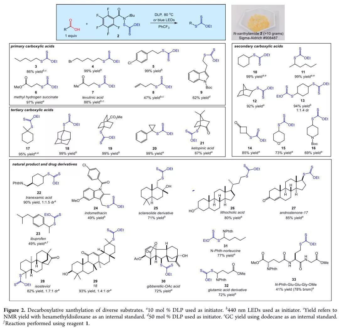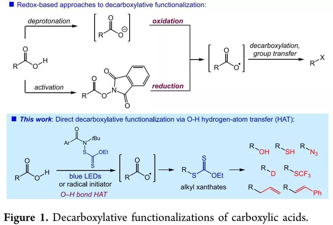 北卡羅萊納大學教堂山分校Erik J. Alexanian教授課題組發展了一種基于五氟苯甲酰胺自由基HAT引發的脂肪酸脫羧黃原酸酯化反應。該反應對包括天然產物和藥物分子在內的多種羧酸均適用。產物中的黃原酸酯基團可進一步發生轉化得到后期修飾的復雜生物活性分子。作者通過對比實驗及理論計算的方法證明了五氟苯甲酰胺自由基對羧基O-H鍵的HAT過程無論在熱力學還是在動力學上都是有利的,為羧基自由基脫羧的進一步發展奠定了基礎。