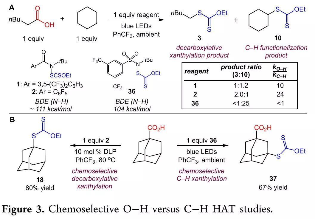 作者通過比較N-黃原酰酰胺和N-黃原酰磺酰胺的反應活性對O-H 鍵HAT過程進行了評估(Figure 3)。由于磺酰胺的N-H鍵BDE弱于羧基O-H鍵BDE(104 vs 112 kcal/mol),在正己酸和環己烷同時存在下,以N-黃原酰磺酰胺為HAT試劑時,僅生成環己烷C-H官能團化產物;而N-黃原酰酰胺則同時引發了環己烷的C-H活化和正己酸的自由基脫羧,證明這兩者具有不同的反應活性。因此作者分別嘗試兩種HAT試劑在金剛烷甲酸上的反應,與預期相同,N-黃原酰酰胺引發了脫羧黃原酸酯化,而N-黃原酰磺酰胺引發了C-H黃原酸酯化。