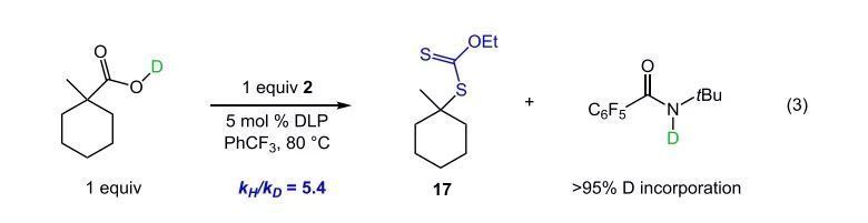作者最后對機理進行了研究。作者在條件優化部分已通過羧酸鹽的反應排除了氧化自由基脫羧過程,通過黑暗中不加入自由基引發劑的實驗證明了反應的自由基歷程。作者進一步通過動力學同位素效應實驗驗證了反應經歷了在相對較弱C-H鍵存在條件下的不可逆O-H鍵HAT過程(eq 3, KIE=5.4),作者認為此化學選擇性可能源于雜原子間HAT的動力學有利性。