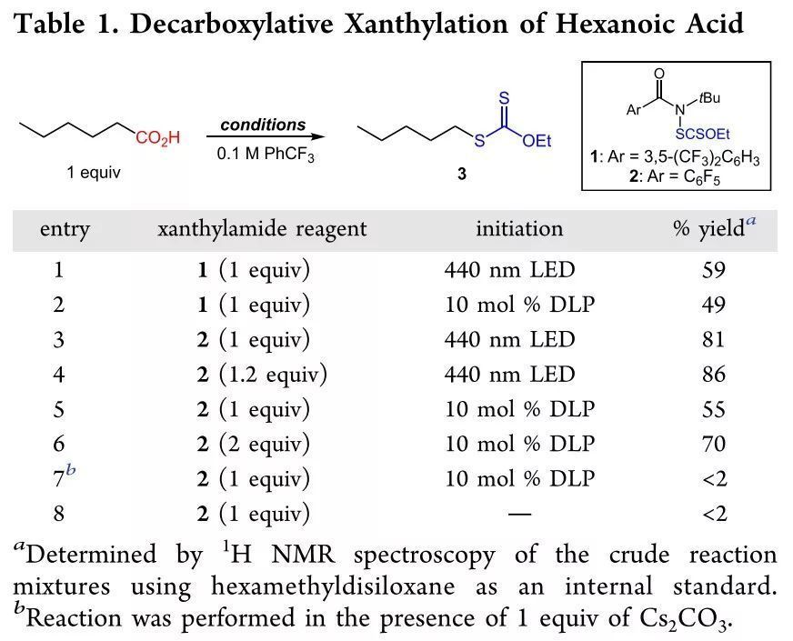 作者首先以正己酸的轉化為模型反應對反應條件進行了探索(Table 1)。在440 nm藍光激發下,以酰胺1為HAT試劑能以59%的收率得到脫羧產物;使用過氧化二月桂酰為自由基引發劑時收率降低;在藍光激發下,將HAT試劑換為N-黃原酰基五氟苯甲酰胺2時效率大大增加,增加試劑2至1.2當量時能得到更好的結果;自由基激發條件換為過氧化二月桂酰時效率略降低,通過控制實驗,作者發現當以羧酸鹽為底物或無自由基引發條件下無反應發生。
