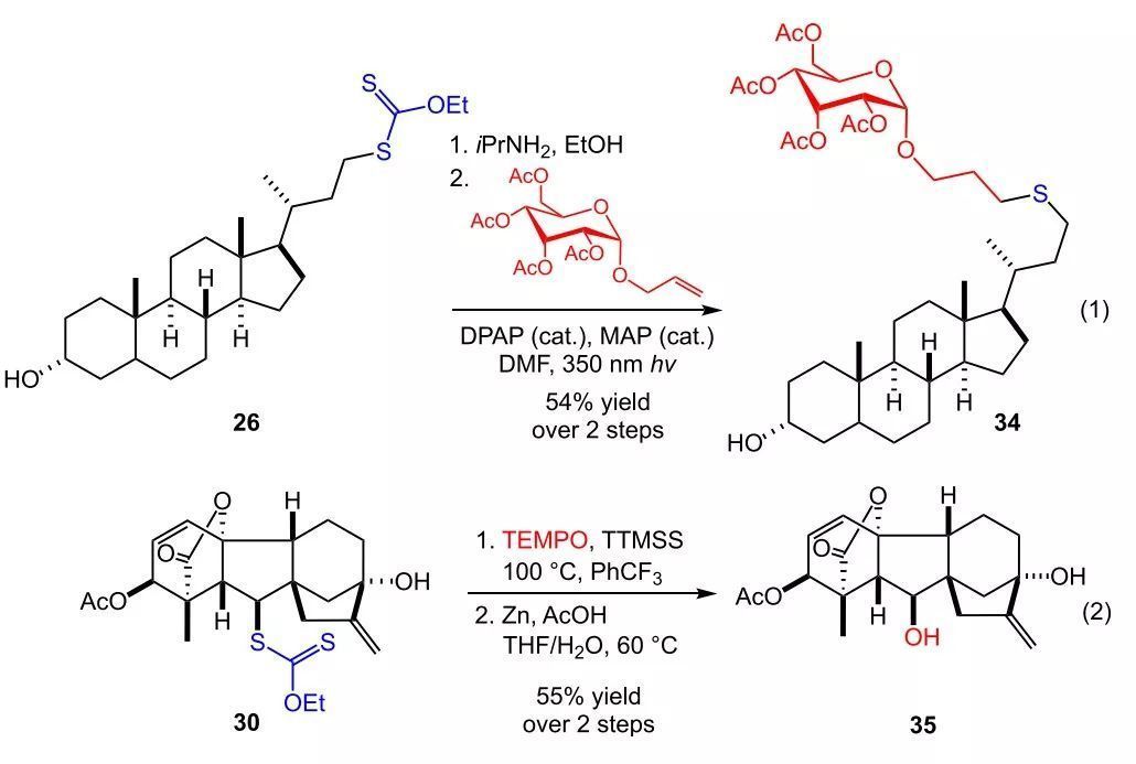 黃原酸酯能進一步發生多種轉化。石膽酸衍生的黃原酸酯26通過胺解以優異收率得到硫醇,隨后與葡萄糖烯丙氧苷發生光激發的Thiol-Ene反應得到偶聯產物(eq 1);赤霉素衍生的黃原酸酯可通過烷氧基胺中間體在鋅粉還原條件下發生N-O鍵斷裂生成羥基衍生物35(eq 2)。