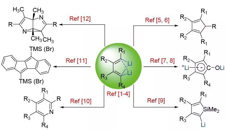圖1 雙鋰試劑,為共軛體系碳負離子化學研究提供新思路[2,3] 百靈威獨家銷售席振峰教授開發的1,4-二鋰丁二烯雙鋰試劑。1,4-二鋰丁二烯雙鋰試劑具有獨特的性質[4],可以用于其它方法難合成(或者不能合成)的功能性有機和金屬有機化合物的合成中,如多取代環戊二烯衍生物[5,6]、多取代環戊烯酮和氧代環戊二烯基雙鋰[7,8]、多取代噻咯和鋰代噻咯衍生物[9]、多取代吡咯和吡啶衍生物[10]、苯并及其它芳香環稠合戊搭烯衍生物[11],以及氮雜半瞬烯和雙吡咯琳衍生物等[12](如圖2)。 圖2 雙鋰試劑,輕松應對6類以上難合成化合物