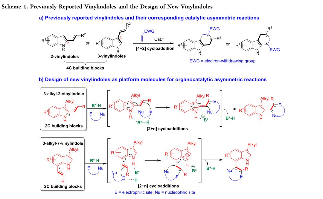江蘇師范大學化學與材料科學學院的石楓課題組利用不對稱有機催化的優(yōu)勢,發(fā)展了一系列獨特的策略,比如設計和發(fā)展多功能平臺分子和有機催化不對稱反應以獲得含吲哚結構的手性雜環(huán)化合物。利用這些策略,合成了一系列高效、對映選擇性優(yōu)異的含吲哚結構的手性雜環(huán)化合物。此外,還研究了某些手性產物的生物活性和催化活性,以更好地了解其潛在的應用。本文主要綜述了石楓課題組在有機催化不對稱合成含吲哚結構的手性雜環(huán)化合物方面的研究進展,發(fā)表在Accounts of Chemical Research,通訊作者為石楓教授。2 有機催化不對稱合成含吲哚結構的手性雜環(huán)化合物的策略烯基吲哚是催化不對稱反應中一類重要的結構單元,用于構筑含吲哚的手性骨架。然而,之前報道的烯基吲哚僅限于2-烯基吲哚和3-烯基吲哚,它們通常作為四碳(4C)合成子,在催化不對稱[4+2]環(huán)加成反應中用于構筑手性六元環(huán)(Scheme 1a)。與此形成鮮明對比的是,文獻中幾乎沒有對其它類型的烯基吲哚進行報道,這極大地限制了烯基吲哚在催化不對稱合成含吲哚結構的手性雜環(huán)化合物中的應用。