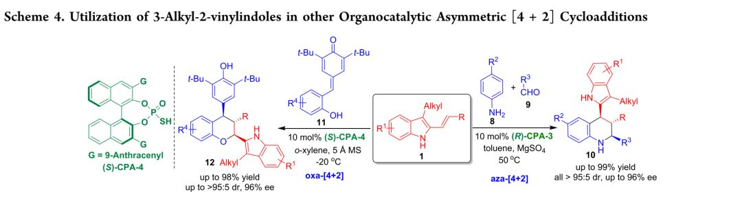 此外,石楓課題組使用3-烷基-2-烯基吲哚1作為平臺分子進行有機催化不對稱aza-[4+2]和oxa-[4+2]環(huán)加成反應,以高產率和優(yōu)異的立體選擇性合成了含吲哚結構的六元手性雜環(huán)10和12(Scheme 4)。
