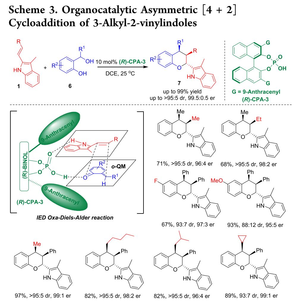 催化不對稱反電子需求(IED)的氧雜Diels-Alder(oxa-DA)反應是構筑六元含氧手性雜環(huán)化合物的有效方法。然而,與已有的反電子需求的氮雜Diels-Alder反應(IED aza-DA)相比,催化不對稱IED oxa-DA反應,特別是在有機催化下進行的不對稱IED oxa-DA反應還遠遠不夠成熟,需要發(fā)現新型的二烯體、親二烯體和有機催化模式。為了解決這個問題,石楓課題組使用3-烷基-2-烯基吲哚1作為富電子親二烯體,并使用由鄰羥基苯甲醇6原位生成的鄰亞甲基醌(o-QMs)作為二烯體,在(R)-CPA-3存在下實現了有機催化不對稱IED oxa-DA反應(Scheme 3)。該反應以氫鍵活化模式進行協同[4+2]環(huán)加成反應,生成了具有優(yōu)異立體選擇性的含吲哚結構的手性色滿骨架7。值得注意的是,底物1和6的R和R1取代基為脂肪族基團時,也以高立體選擇性進行了該反應,從而大大拓寬了反應的底物范圍。