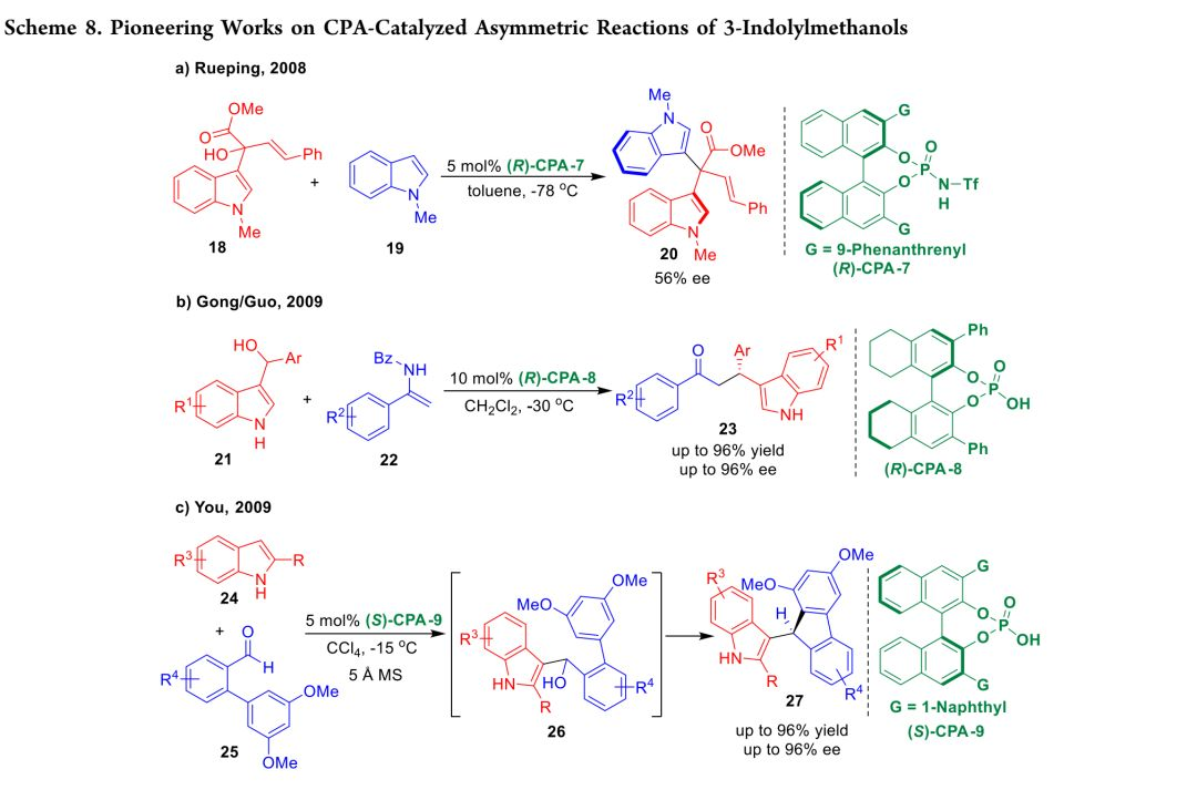 3-吲哚甲醇催化不對稱反應的開創(chuàng)性工作發(fā)表于2008年。在那一年,Rueping課題組報道了在手性N-三氟磷酰胺(R)-CPA-7存在下,3-吲哚甲醇18與N-甲基吲哚19的催化不對稱取代反應,該反應以中等的對映選擇性(56% ee)合成了手性雙吲哚20(Scheme 8a)。然而,這項工作是首例報道3-吲哚甲醇的催化不對稱反應。不久,Gong、Guo課題組在(R)-CPA-8的催化下,以烯酰胺22為親核試劑,首次報道了3-吲哚甲醇21的高對映選擇性取代反應,得到了高產率和優(yōu)異對映選擇性的手性吲哚衍生物23(Scheme 8b)。幾乎同時,You課題組報道了吲哚24與2-甲酰基聯苯衍生物25在(S)-CPA-9存在下的串聯雙Friedel-Crafts反應,以良好的產率和高對映選擇性得到了含吲哚結構的手性芴衍生物27(Scheme 8c)。在該反應中,先是原位生成3-吲哚甲醇26,隨后26發(fā)生分子內Friedel-Crafts反應生成最終產物27。