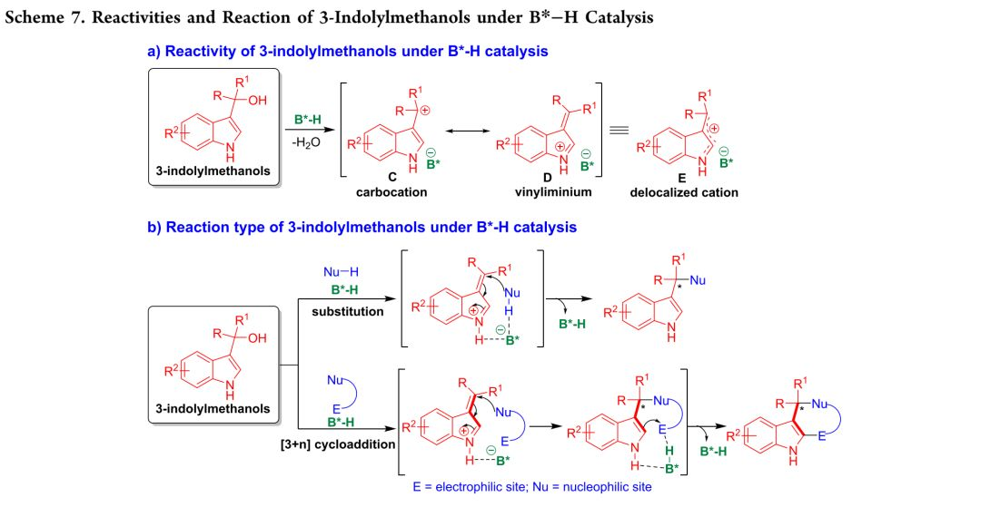基于這種反應性,3-吲哚甲醇在B*-H催化下的反應可分為催化不對稱取代和[3+n]環(huán)加成反應(Scheme 7b)。當親核試劑被用作反應底物時,B*-H的陰離子可以同時活化烯基亞胺正離子D和親核試劑,促進對映選擇性1,4-加成反應得到手性取代產物。當使用同時具有親核和親電位點的反應底物時,將發(fā)生基于吲哚C2位親核性的對映選擇性1,4-加成和后續(xù)分子內環(huán)化反應,以完成催化不對稱[3+n]環(huán)加成。