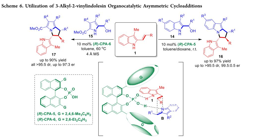 為了解決這個問題,石楓課題組設計了3-烷基-2-烯基吲哚和3-烷基-7-烯基吲哚作為平臺分子用于有機催化不對稱反應(Scheme 1b)。這些新型烯基吲哚是基于以下考慮而設計的:(1)在吲哚的C3位引入烷基將降低該位置的親核性,并使烯基的末端位置親核性增強,使這類烯基吲哚成為兩碳(2C)合成子用于[2+n]環(huán)加成反應;(2)吲哚中的N-H基團將使這些烯基吲哚很容易通過氫鍵作用被手性Br?nsted酸(B*-H)活化,使它們更容易與不同的底物發(fā)生對映選擇性[2+n]環(huán)加成反應以合成結構多樣的含吲哚結構的手性雜環(huán)化合物。