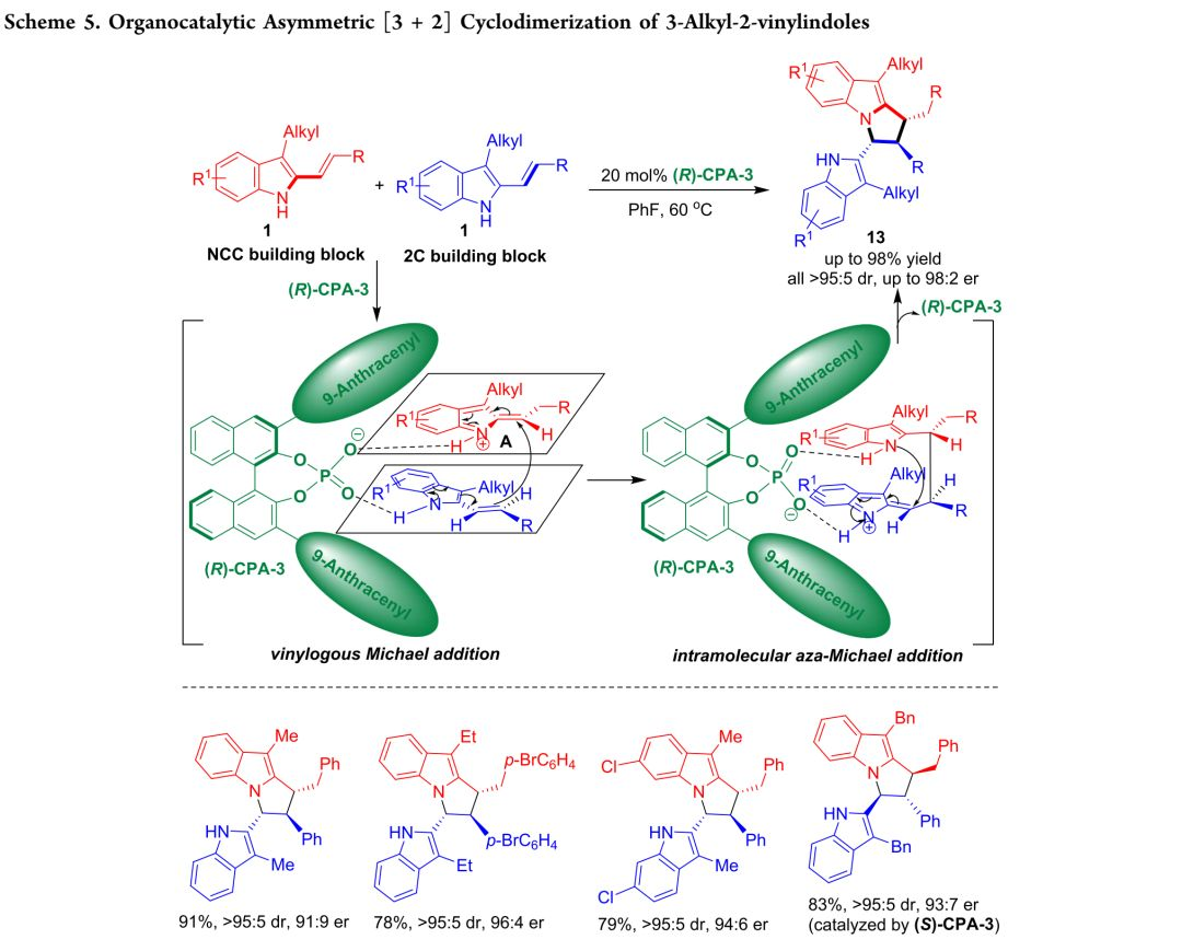 在上述反應中,3-烷基-2-烯基吲哚1總是作為有機催化不對稱[2+n]環(huán)加成反應中的2C合成子。石楓課題組在研究中經常觀察到3-烷基-2-烯基吲哚1發(fā)生不希望的[3+2]環(huán)二聚反應產生的副產物。有趣的是,在該反應中,1的一個分子作為氮-碳-碳(NCC)合成子,而1的另一個分子作為預期的2C合成子,從而導致[3+2]環(huán)二聚反應。在(R)-CPA-3存在下,該反應的催化不對稱形式得以實現,得到了高產率和良好立體選擇性的手性雜環(huán)13(Scheme 5)。結果表明,1的一個分子可以質子化得到烯基亞胺正離子A,而烯基亞胺正離子A被1的另一個分子進攻,通過(R)-CPA-3活化,以立體選擇性的方式進行了插烯Michael加成/分子內aza-Michael加成,從而完成了不對稱[3+2]環(huán)二聚反應。