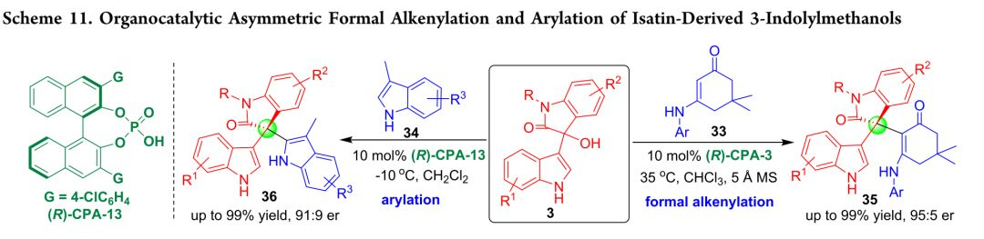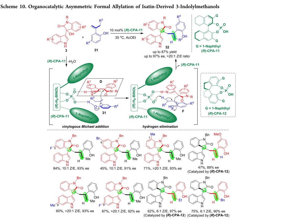 首先,石楓課題組報道了3-吲哚甲醇3與鄰羥基苯乙烯31的催化不對稱取代反應(Scheme 10)。有趣的是,該反應類似于ene反應,以較高的(Z/E)-選擇性和優(yōu)異的對映選擇性得到了手性的烯丙基取代的氧化吲哚化合物32。值得注意的是,手性產物32不僅具有季碳立體中心,而且還形成了新的C=C鍵。在所建議的反應途徑中,(R)-CPA-11通過氫鍵和離子對相互作用同時活化鄰羥基苯乙烯31和亞胺正離子D,它們由3-吲哚甲醇3原位生成,促進了對映選擇性插烯Michael加成和后續(xù)的氫消除,以精確控制的對映選擇性和(Z/E)-選擇性實現了3-吲哚甲醇3的形式烯丙基化。