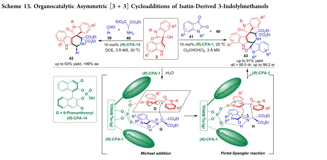 基于3-吲哚甲醇在Scheme 7中的反應性,石楓課題組分別以靛紅衍生的3-吲哚甲醇3和不同的烯基吲哚(1、2和37)作為三碳(3C)和2C合成子,在CPA存在進行催化不對稱[3+2]環(huán)加成反應,得到了具有優(yōu)異立體選擇性的吲哚稠合的手性五元環(huán)(4、5和38)(Scheme 12)。值得注意的是,除了N-未受保護的烯基吲哚1和2(詳見Scheme 2),N-甲基保護的3-烯基吲哚37也能順利進行反應,以良好的反應結果得到了手性產物38。這一反應十分具有挑戰(zhàn)性,因為(S)-CPA-13在反應過程中僅通過一種結合模式活化烯基亞胺正離子D。