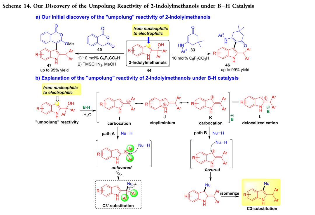Scheme 14b中解釋了2-吲哚甲醇反轉的反應性。在Br?nsted酸(B-H)存在下,2-吲哚甲醇在脫水后可產生碳正離子I、K和烯基亞胺正離子J,這可被描述為非定域正離子L。當親核試劑進攻碳正離子I時,與碳正離子相連的兩個大體積芳基將在空間上阻礙親核試劑對碳正離子的進攻,并且親核試劑與C3’-取代產物中的兩個大體積芳基之間存在空間排斥作用,使這一過程非常不利。相反,當親核試劑進攻碳正離子K時幾乎沒有空間位阻,C3取代產物結構中也幾乎沒有空間排斥作用,使得這一反應途徑更加有利。這就解釋了為什么吲哚的C3位從親核性轉變?yōu)橛H電性。