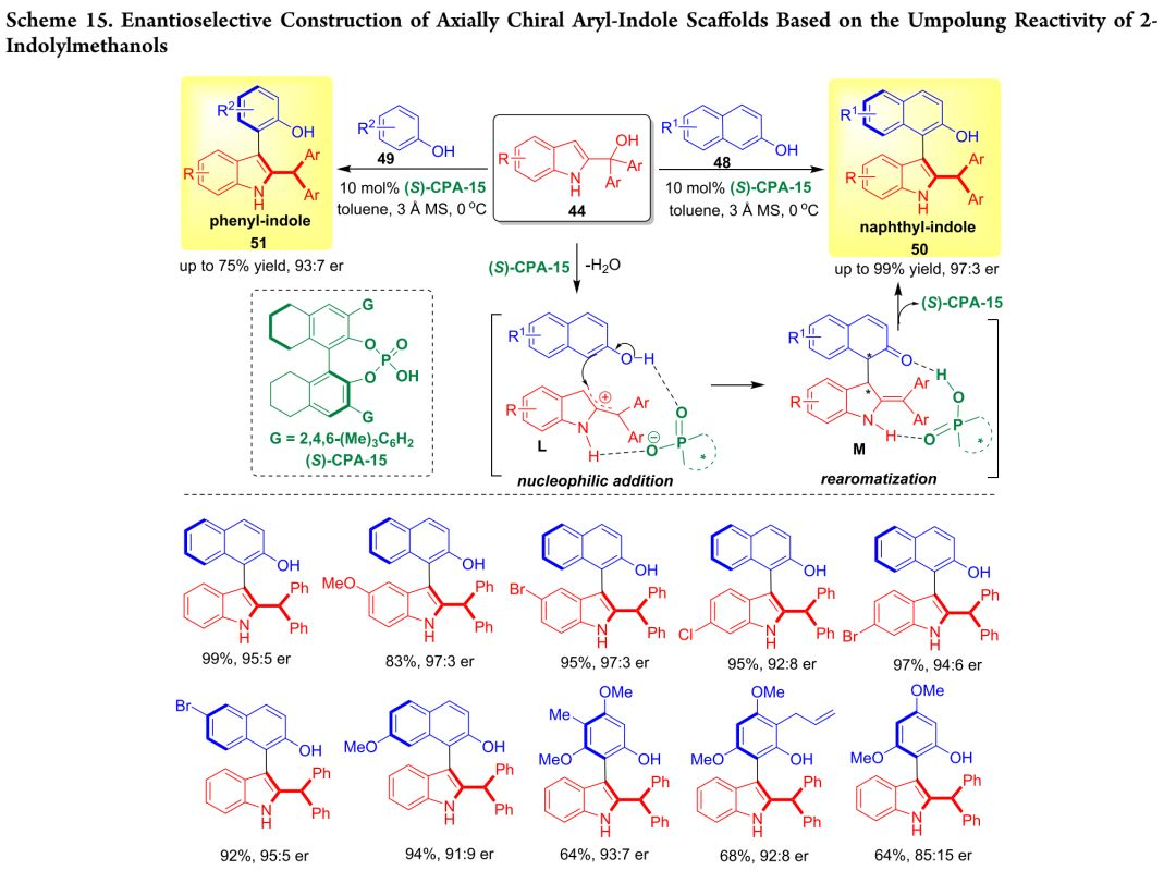 基于2-吲哚甲醇反轉的反應性,石楓課題組實現了在(S)-CPA-15催化下2-吲哚甲醇44和2-萘酚48或苯酚49的不對稱偶聯反應,從而以良好的產率和較高的對映選擇性合成了新型軸手性萘基吲哚或苯基吲哚骨架(50和51)(Scheme 15)。該反應旨在利用2-吲哚甲醇44的C3位的親電性。以軸手性萘基吲哚50的形成為例,在(S)-CPA-15存在下,2-吲哚甲醇44轉化為離域正離子L,由于吲哚C3位的親電性,易被2-萘酚48進攻。在此過程中,CPA陰離子通過氫鍵和離子對相互作用同時活化離域正離子L和2-萘酚48以促進對映選擇性親核加成,生成具有中心手性的中間體M。然后,中間M快速重新芳構化產生軸手性萘基吲哚產物50。值得注意的是,在文獻中幾乎沒有對映選擇性構筑含吲哚結構軸手性骨架的報道,因為以對映選擇性的方式構筑五元軸手性骨架是相當具有挑戰(zhàn)性的。因此,該反應為含吲哚結構的軸手性骨架的不對稱催化反應構筑提供了強有力的策略。