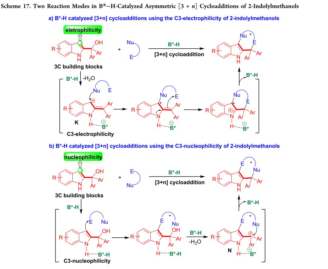 除了催化不對稱取代反應外,石楓課題組還致力于發(fā)展2-吲哚甲醇的催化不對稱[3+n]環(huán)加成反應,其中這類平臺分子作為3C合成子。他們發(fā)現在2-吲哚甲醇的B*-H催化不對稱[3+n]環(huán)加成反應中存在兩種不同的反應模式(Scheme 17)。第一種是基于C3位親電性,即2-吲哚甲醇的反轉反應性(Scheme 17a)。也就是說,在B*-H存在下,2-吲哚甲醇經脫水轉化為碳正離子K,K被另一反應物的親核位點(Nu)進攻而發(fā)生[3+n]環(huán)加成。相比之下,第二種反應模式是基于2-吲哚甲醇的C3位親核性(Scheme 17b)。在這個過程中,第一步是吲哚C3位到另一反應物親電位點(E)的親核加成,第二步是通過脫水形成碳正離子N,再由親核位點(Nu)進攻碳正離子N以完成[3+n]環(huán)加成。