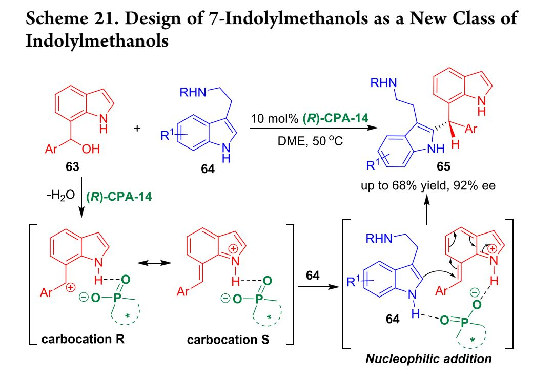 此外,石楓課題組還設計了7-吲哚甲醇63作為一類新型的吲哚甲醇用于有機催化不對稱反應。在(R)-CPA-14存在下,7-吲哚甲醇63與色胺64的反應順利進行,以中等的產率和優(yōu)異的對映選擇性得到了手性7-吲哚甲醇65(Scheme 21)。軸手性骨架的不對稱催化構筑已經引起了化學界的廣泛關注,然而,已報道的大多數軸手性骨架為聯芳基類,如聯萘、苯萘和聯苯骨架。相反,軸手性雜環(huán),特別是軸手性五元雜環(huán)的不對稱催化構筑,由于其較低的旋轉能壘和較弱的構象穩(wěn)定性而受到限制。因此,發(fā)展不對稱催化構筑軸手性五元雜環(huán)的創(chuàng)新性策略是十分需要的。吲哚是重要的五元雜環(huán)化合物,具有獨特的反應活性。雖然含吲哚結構的手性雜環(huán)化合物的催化不對稱合成發(fā)展迅速,但含吲哚結構的軸手性骨架的不對稱催化構筑卻鮮有報道,但這對于研究生物活性化合物和優(yōu)異的手性催化劑是非常有價值的。