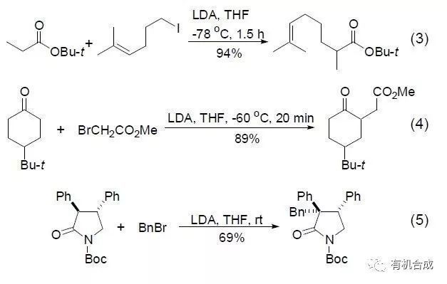 LDA最直接的用途是催化醛、酮、酯和酰胺的α-位烷基化反應[4~10]。由于這些化合物中羰基對α-位亞甲基和次甲基的致活作用,LDA可以在低溫下攝取它們的質子而生成碳負離子。在各種烷基化試劑的存在下,可以方便地引入各種各樣的基團。因為該試劑在0 oC以上時就會發生分解,所以有時需要加入等摩爾的HMPA作為輔助溶劑來增加試劑的反應性和穩定性。該反應可以在低溫下1~2 h 內完成,烯鍵不受到任何影響 (式3)[4~6],烷基化試劑中帶有酯基也不受到任何影響 (式4)[4~7]。但是,酰胺的反應需要升至室溫進行 (式5)[8]。