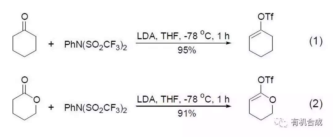 LDA廣泛地應用于醛、酮和酯的烯醇化反應,生成的烯醇離子經硅衍生物或者磺酰基捕獲后生成相應的硅醚或者磺酸酯。由于磺酸酯基與sp2雜化碳原子相連,所以非常容易發生金屬催化的后續反應,使得該反應更加有意義。該反應一般在低溫下數分鐘內完成,反應條件非常溫和,不對其它官能團產生明顯的影響。產物的產率主要受到捕獲試劑活性的影響,三氟甲基磺酸酯非常容易得到滿意的結果(式1,式2)[2,3]。