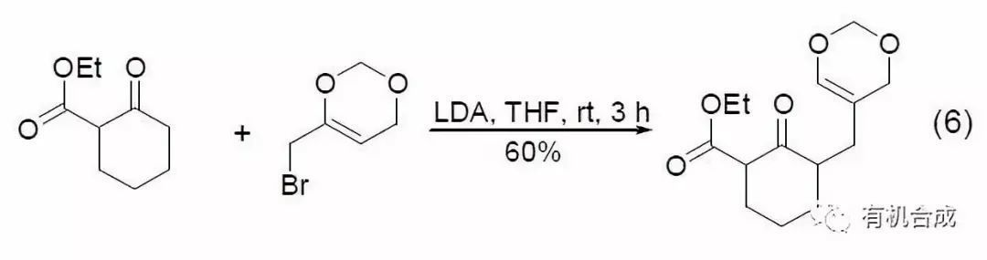 當1,3-二羰基化合物在LDA 的作用下進行α-位烷基化反應時,由于位阻作用,烷基化發生的位置不是人們認為酸性較強的2-位,而是旁邊的α-位。這種情況在1,3-酮酯的反應中具有非常好的區域選擇性 (式6)[11,12]。