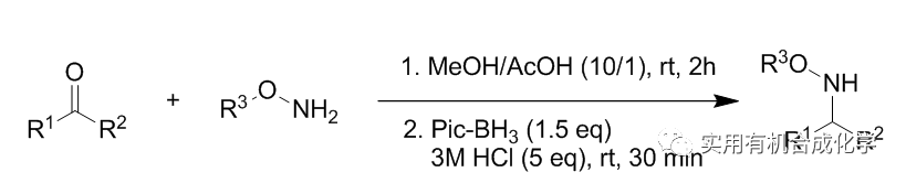 除此以外,2-甲基吡啶硼烷(Pic-BH3)還能用于醛(酮)與羥胺的還原胺化(Heterocycles, 2009, 78, 463 - 469)生成烷基羥胺。該反應以MeOH/AcOH(10/1) 作為溶劑,醛(酮)和羥胺室溫下攪拌2小時后,加入1.5 eq 的Pic-BH3和5 eq 3M HCl,反應可高產率的合成烷基羥胺。