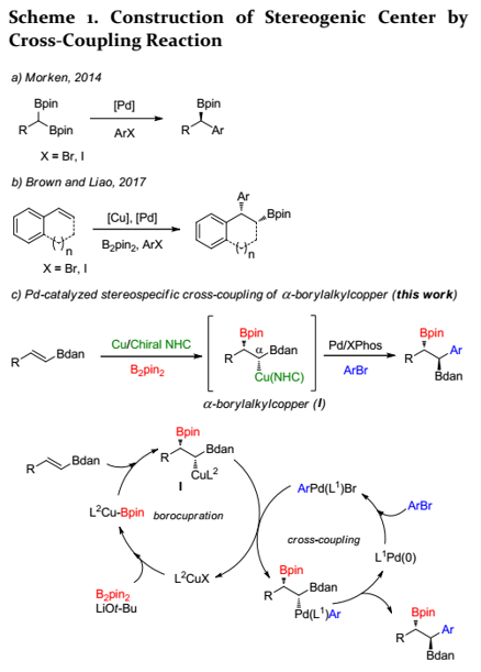 鈀催化的交叉偶聯(lián)反應(yīng)是構(gòu)建C-C鍵最有效的工具之一。目前,sp2-雜化的有機(jī)金屬親核試劑與芳基鹵化物的交叉偶聯(lián)取得了顯著進(jìn)展,但sp3-雜化有機(jī)金屬的開(kāi)發(fā)相對(duì)較少。特別地,由于烷基親核試劑的構(gòu)型不穩(wěn)定,與烷基有機(jī)金屬通過(guò)鈀催化的交叉偶聯(lián)構(gòu)建含手性中心的C-C鍵具有挑戰(zhàn)性。近來(lái),Morken課題組利用手性催化劑將鈀催化下含手性中心的C-C鍵生成擴(kuò)展到1,1-雙硼烷基烷烴與芳基鹵化物的交叉偶聯(lián)(Scheme 1a)。最近,Brown和廖建等人報(bào)道了Pd/Cu協(xié)同催化的烯基芳烴的不對(duì)稱(chēng)芳基硼化,其中涉及手性有機(jī)銅中間體與芳基鹵化物的立體定向交叉偶聯(lián)(Scheme 1b)。至今,尚未報(bào)道利用手性異雙金屬中間體作為有機(jī)金屬親核試劑的不對(duì)稱(chēng)交叉偶聯(lián)。α-硼烷基銅是合成多功能化合物的有用中間體。迄今為止,尚未報(bào)道通過(guò)手性α-硼烷基銅與Csp2親電試劑偶聯(lián)構(gòu)建Csp2-Csp3鍵。近日,韓國(guó)成均館大學(xué)Jaesook Yun課題組開(kāi)發(fā)了一種鈀催化下手性α-硼烷基銅與芳基溴化物的立體定向交叉偶聯(lián)方法(Scheme 1c),該成果發(fā)表于近期ACS Catal.(DOI: 10.1021/acscatal.9b05213)。