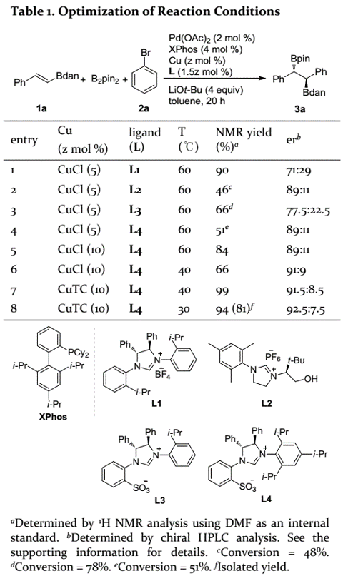 基于外消旋結(jié)果,作者通過(guò)1a-Bdan和苯基溴化物(2a)之間的偶聯(lián)篩選了手性NHC配體(Table 1),并發(fā)現(xiàn)在NHC-Cu絡(luò)合物存在下,L4的反應(yīng)性和對(duì)映選擇性最佳。將銅催化劑的負(fù)載量提高至10 mol%,可以促進(jìn)反應(yīng);將反應(yīng)溫度降至40 ℃后,對(duì)映選擇性提高,并具有中等反應(yīng)性;將CuCl用CuTC替換后,產(chǎn)物收率提高。最后,作者在30 ℃下以81%的分離收率和高對(duì)映體比例(92.5:7.5)得到產(chǎn)物3a,并選擇該條件作為最佳反應(yīng)條件。