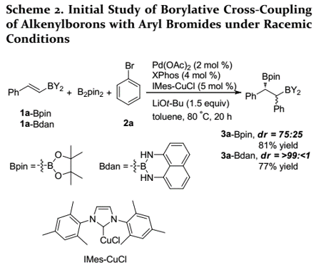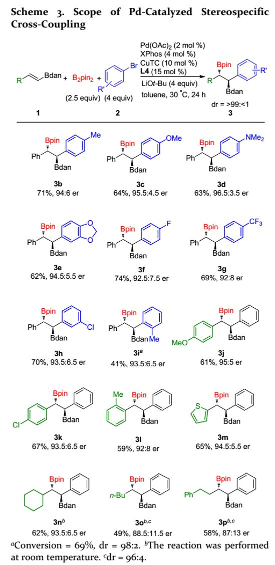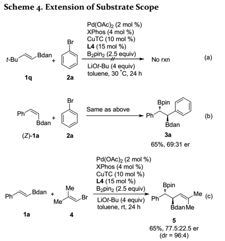 首先,在IMes-CuCl、Pd(OAc)2和XPhos催化劑存在下,作者開(kāi)始研究苯乙烯基硼底物(1a)、溴化苯(2a)和雙(頻哪醇)二硼(B2pin2)之間的反應(yīng)(Scheme 2)。含Bpin基團(tuán)的烯烴可以良好的收率得到預(yù)期產(chǎn)物,但非對(duì)映選擇性差(d.r=3:1);當(dāng)用1,8-二氨基萘基硼酰胺(Bdan)底物時(shí),可以高收率得到單一非對(duì)映異構(gòu)體。因此,作者利用烯基硼酰胺進(jìn)一步研究了鈀催化的立體定向交叉偶聯(lián)反應(yīng)。