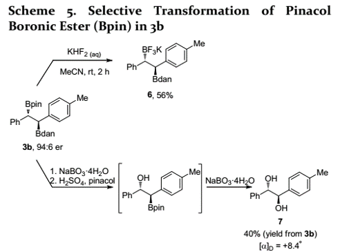 最后,作者考察了所得手性1,2-二硼基烷烴中Bpin基團(tuán)的選擇性轉(zhuǎn)化(Scheme 5)。由于Bdan的Lewis酸性低于相應(yīng)硼酸酯的Lewis酸性,可以將Bpin選擇性轉(zhuǎn)化為三氟硼酸鉀(BF3K),得到6。此外,作者還將3b轉(zhuǎn)化為反式1,2-雙羥基化合物。然而,利用3b進(jìn)行胺化和Zweifel烯化均未成功。