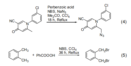 在過氧苯甲酸和NBS作用下,芳烴上的甲基上的一個氫原子可被溴代(式 4,式 5)[6,7]。