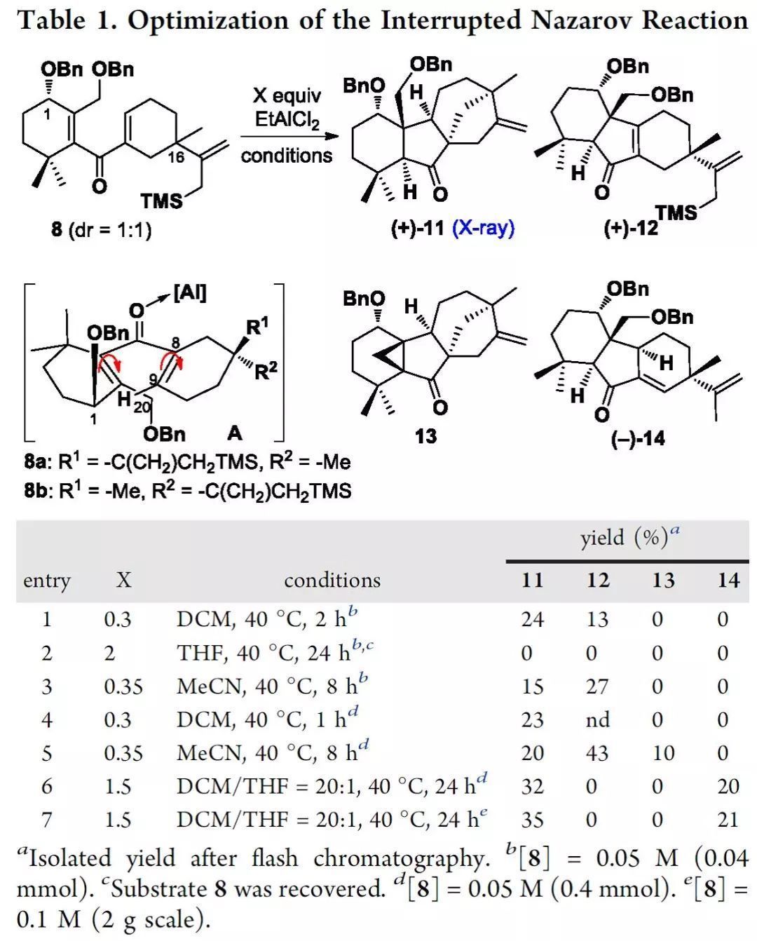 作者首先制備了非對映異構體混合物為1:1的酮8(Table 1),以評估(C1和C16)立體化學對Nazarov/Hosomi-Sakurai串聯反應的影響。通過對路易斯酸的篩選,作者發現僅EtAlCl2有利于反應的轉化。所得的產物(11-14)表明此反應的兩個重要特征:(1)可以通過C1和C20 芐基保護基來調節產物的旋光選擇性;(2)反應是以立體選擇性的方式形成了中斷的Nazarov反應的產物。隨后經溶劑等條件的進一步優化,在克級規模下產物11和14的收率分別達到>30%和>20%(entries 6和7)。
