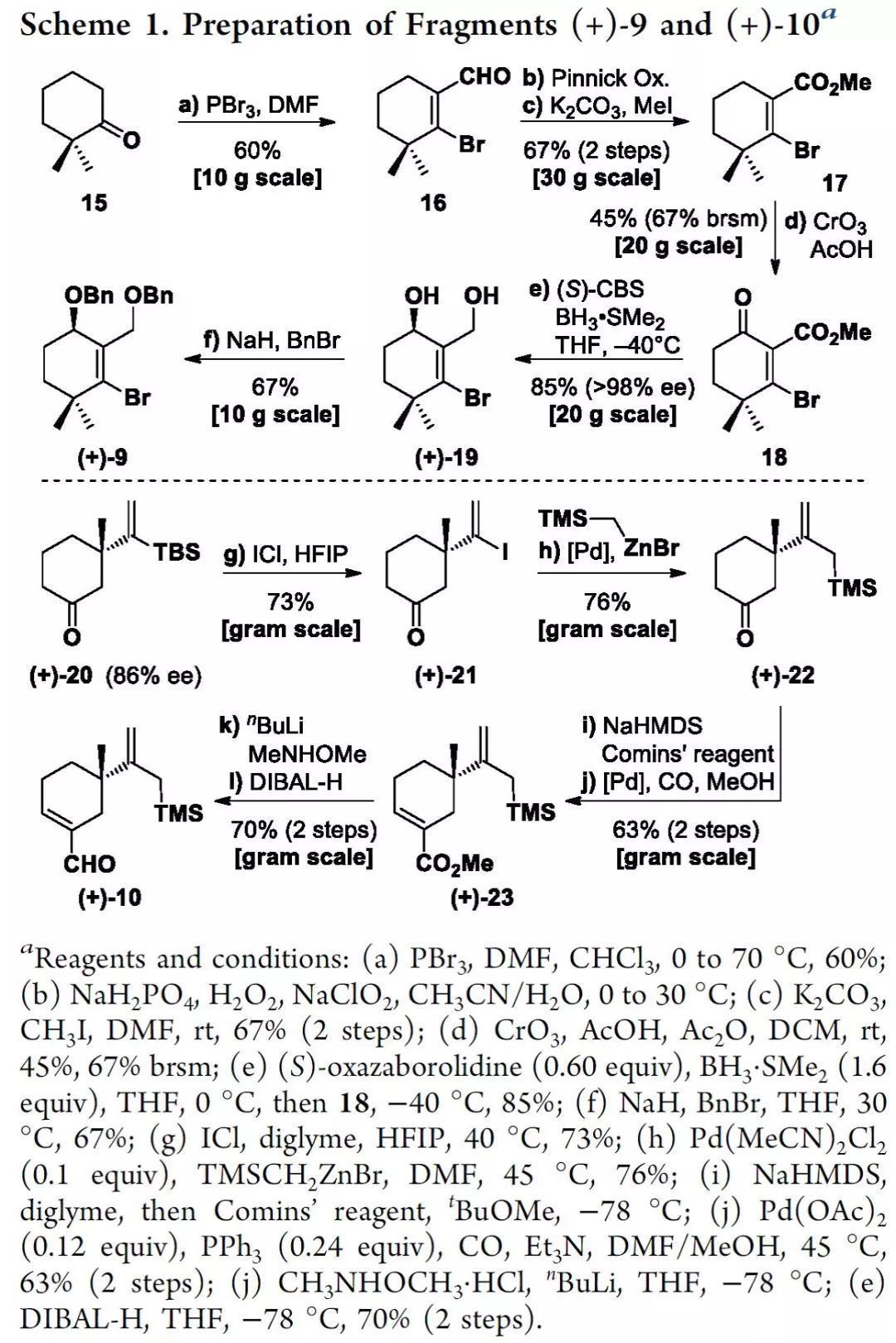 基于對Nazarov/Hosomi-Sakurai串聯反應的研究結果,作者調整了合成路線以制備(+)-9(Scheme 1)。酮15經Vilsmeier反應得到β-溴醛16,其隨后經Pinnick氧化和甲基化轉化為酯17。通過篩選各種烯丙基氧化條件,作者發現CrO3可以在20 g規模下以45%的收率生成烯酮18。化合物18在過量的BMS(硼烷二甲硫醚絡合物)和CBS(2-甲基-CBS-惡唑硼烷)作用下直接以優異的對映選擇性還原得到手性二醇(+)-19,其經芐基保護得到(+)-9。